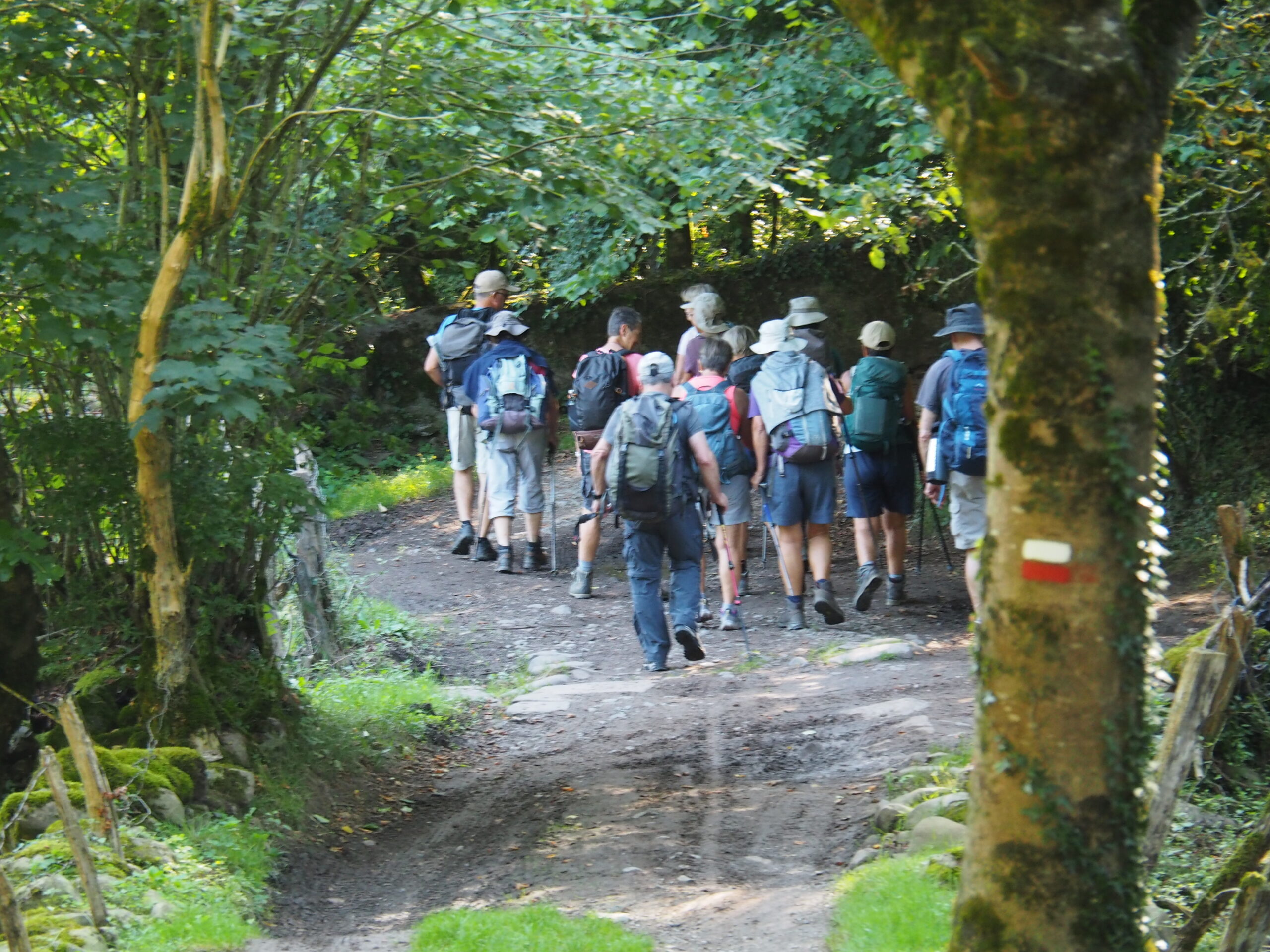 Skupina jednodenních přede mnou. Závidím jim lehké batohy a nezávidím těžké boty 🙈. Všimnete si značky na stromě.